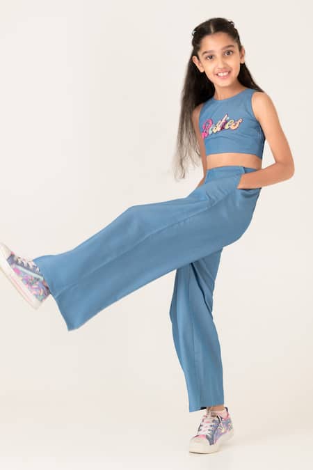 Blue denim crop top featuring placed thread embroidered 'Besties' motif. Paired with matching palazzo pants for a coordinated look.