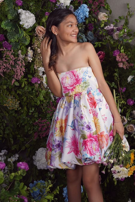 Shop_Panchhi By Kanupriya Tibrewala_Multi Color Satin Camellia Floral Print Tube Dress_Online_at_Aza_Fashions