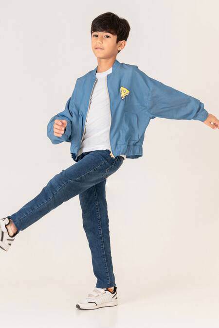 Blue denim jacket featuring a placed thread embroidered alphabet 'A'