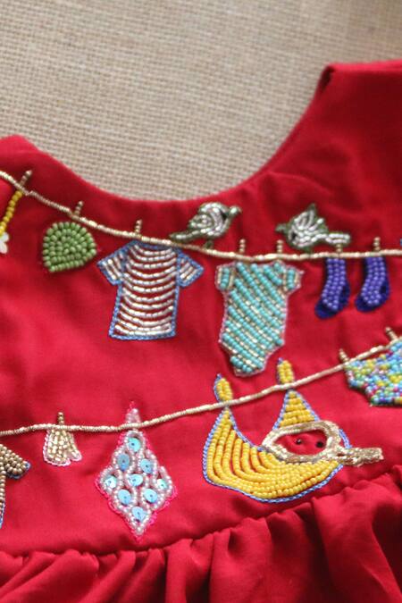 Embroidered motifs of clothes and accessories on the bodice., Contrast trim detailing on the kurta and dhoti pant.