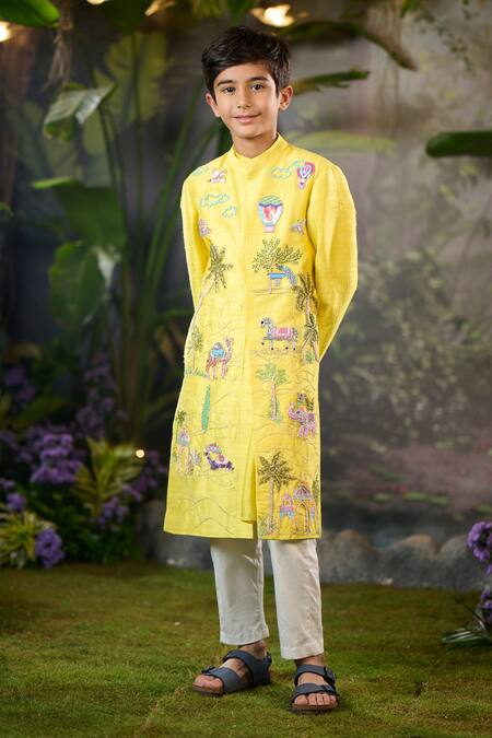 Yellow sherwani featuring intricate embroidery and a front button closure. Paired with a matching yellow kurta and off-white cotton satin pant.