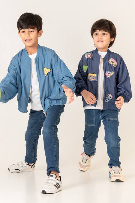 Blue denim bomber jacket featuring patchwork thread embroidered motifs