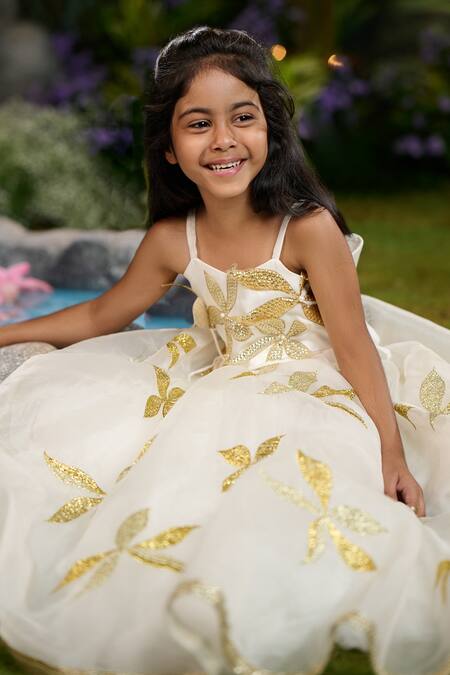 Off white lehenga featuring gold floral embroidery with a flared silhouette. Paired with a matching blouse and a tulle dupatta.