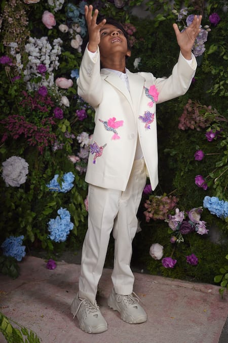 Multi color blazer featuring hand embroidered hummingbirds in terry wool and giza cotton. Paired with a matching shirt and pant.