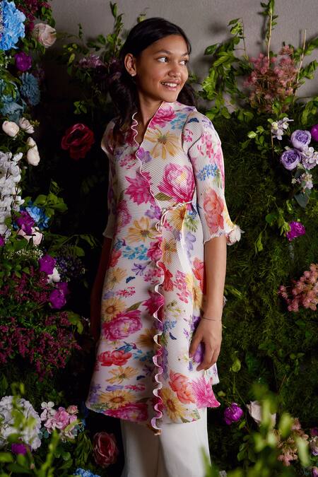 Buy_Panchhi By Kanupriya Tibrewala_Multi Color Georgette, Satin Iris Floral Print Overlapped Tunic And Palazzo Set_at_Aza_Fashions