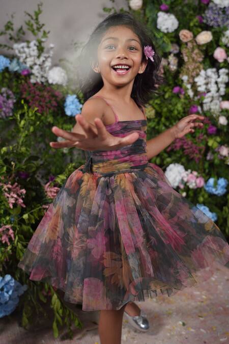 Multi-colored tulle dress featuring a floral print and pleated bodice detailing