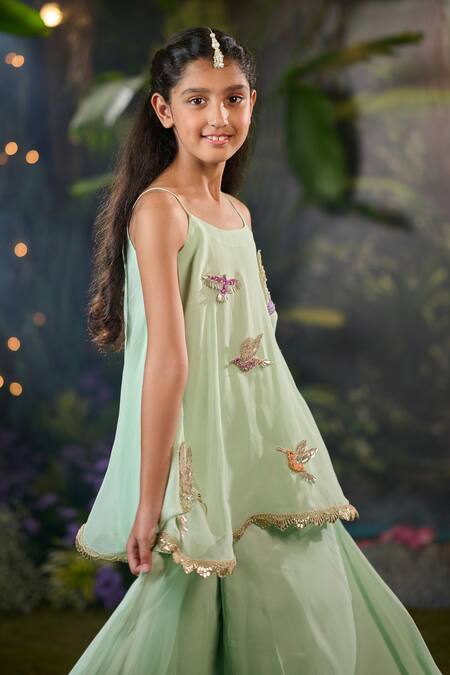 Mint green tunic crafted from georgette featuring intricate embellishments. Paired with a flowing tulle sharara for a complete look.