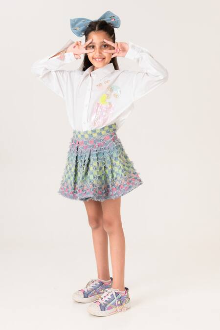 White shirt featuring placed applique patterns with a shirt collar and full sleeves. Paired with a textured checkered skirt in vibrant colors.