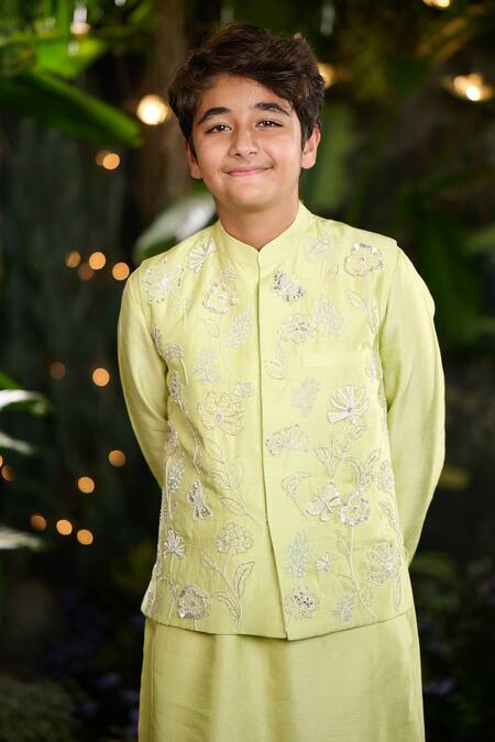 Summer green bundi featuring intricate floral embroidery, paired with a matching kurta and off-white pants. The set is designed for boys and made from a silk blend and cotton satin.