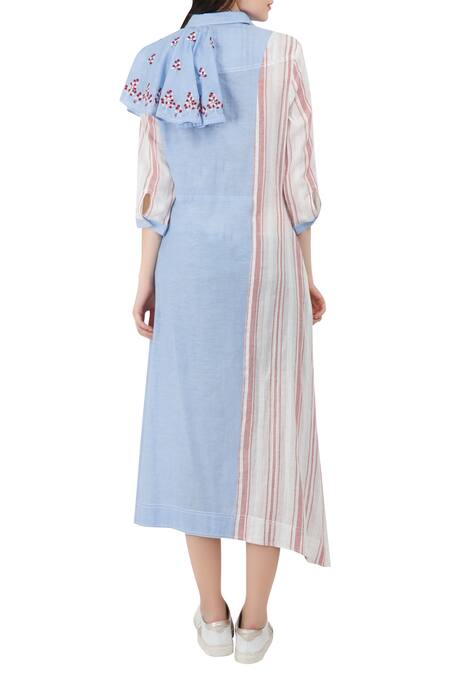 Buy_S & V Designs_Blue Cotton Embroidered Spread Collar Panel Midi Dress_at_Aza_Fashions