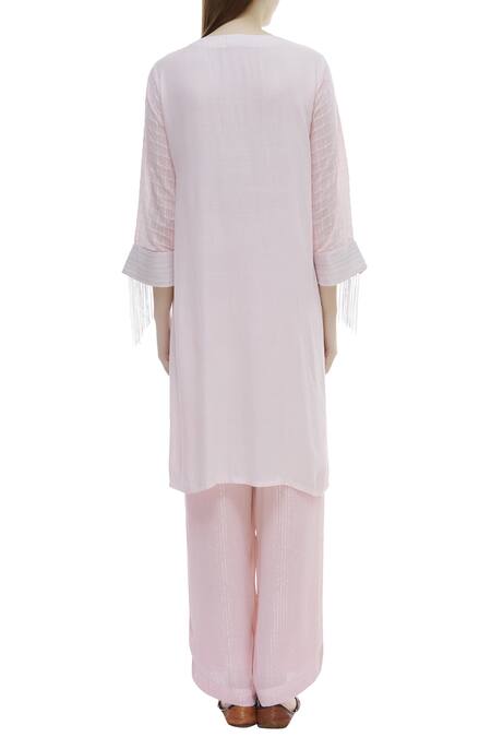 Light pink kurta with checkered panel & fringes.