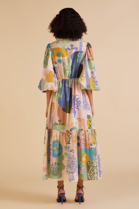 Multi color tiered midi dress crafted in linen featuring short bishop sleeves and a V neckline