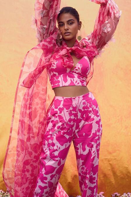 Pink floral print cape featuring 3D embellishments and a tie-up neckline. Paired with a matching printed bustier and pant.