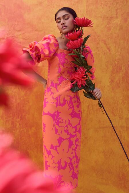Pink & orange sheath dress featuring floral prints and sequin embellished highlights