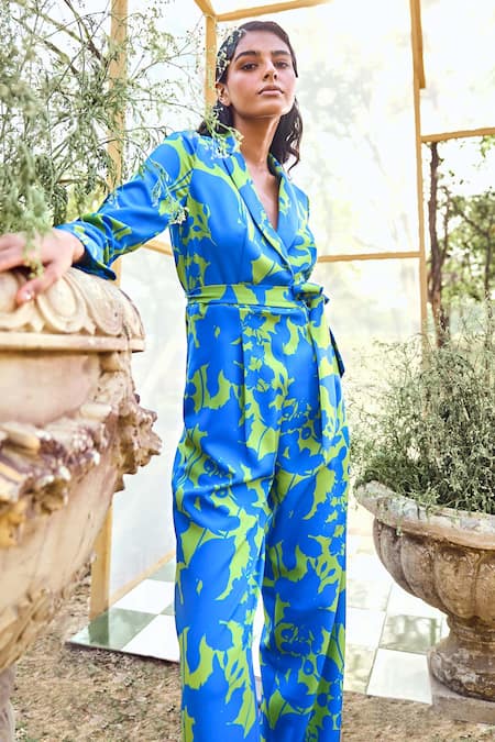 Cobalt and lime floral printed jumpsuit featuring a notched lapel and straight full sleeves. Comes with a matching belt and pleated accents.
