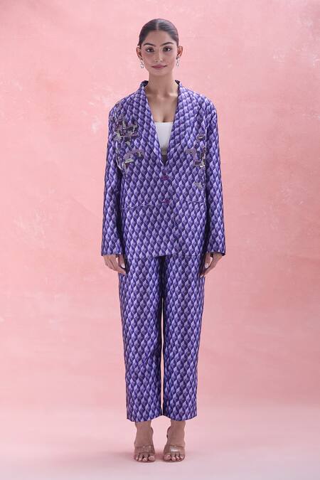 Purple blazer featuring all-over geometric dawn prints and placed embroidery work. Coordinating pant completes the set.