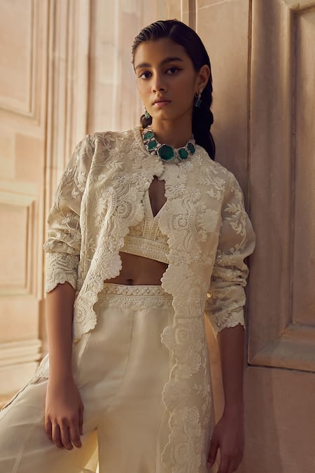 Ivory sharara featuring a hand embellished waistband. Paired with a matching bustier and an intricately embroidered jacket with floral sequins and crystal work.