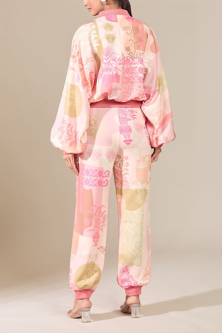Multi colored jacket featuring floral prints with a zipper closure. Paired with coordinating jogger pants with elastic cuffs.