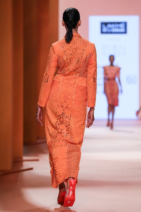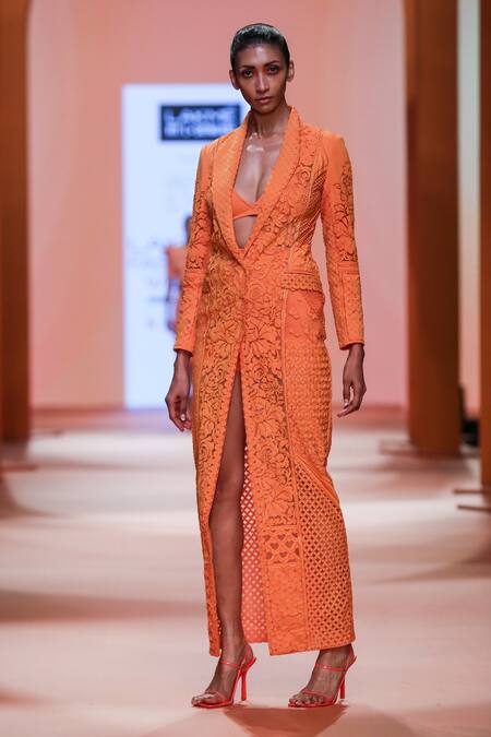 Buy_Pankaj & Nidhi_Orange Tulle, Jersey Lined With Organza Floral Appliques Solarium Blazer Dress_at_Aza_Fashions