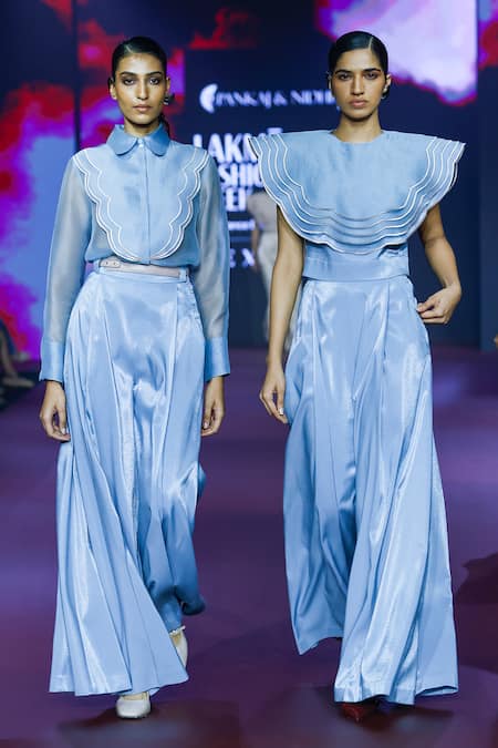 Blue Silk Organza Embroidery Collared Sterling Scalloped Layered Shirt