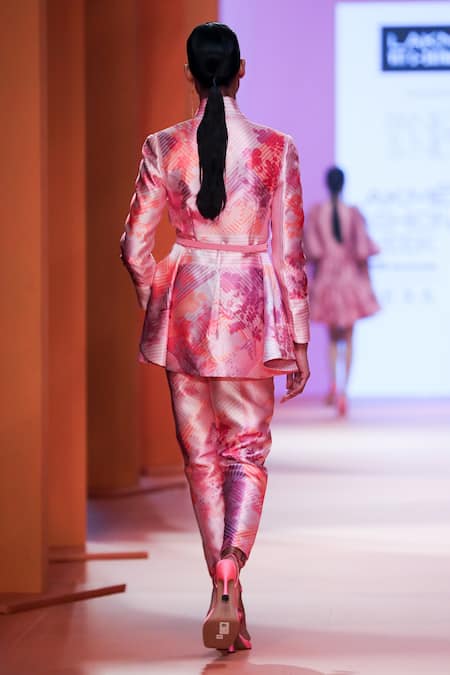Pink-orange peplum jacket in Japanese kimono graphics, floral & striped patterns. Comes with belt.