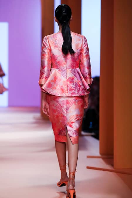 Buy_Pankaj & Nidhi_Pink Twill Lined With Floral And Syrus Peplum Top And Skirt Set_at_Aza_Fashions