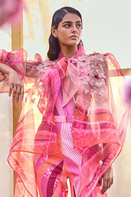 Pink Organza, Crepe Turtle Neck Willa High Low Sheer Cape And Pant Set