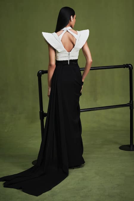 Black pre-draped saree crafted in crepe georgette. Paired with an ivory wing sleeves halter neck harness top featuring tonal cut dana embellishments.