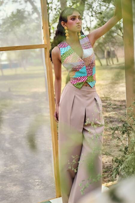 Beige waistcoat featuring geometric hand embroidery and cutout detailing. Paired with high-rise wide-leg trousers that include side seam pockets.