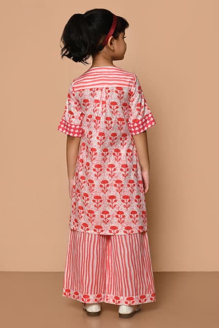 Red anarkali featuring floral print and gathered detailing on the waistband. Paired with stripe print palazzo with an elasticated waistband.
