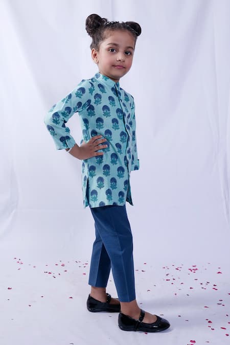 Blue kurta featuring a mandarin collar and long sleeves with hand block print floral motifs. Paired with straight fit pants.