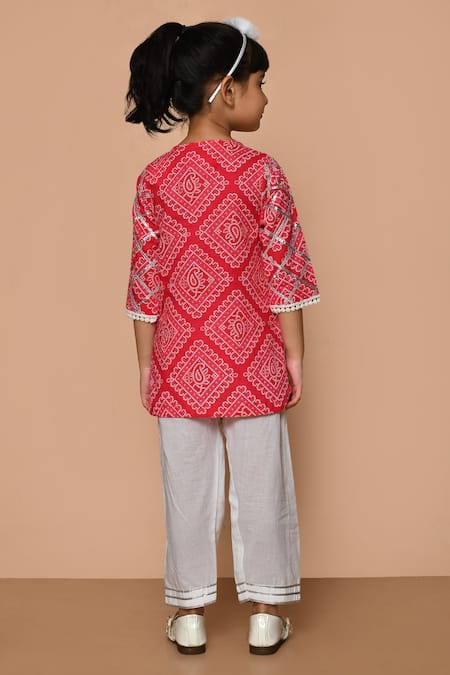 Pink kurta featuring paisley and bandhani hand block print with gota embroidered sleeve hem. Paired with salwar featuring an elasticated waistband.