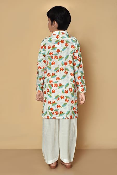 White kurta featuring flower hand block print, spread collar, and full sleeves. Paired with a matching pyjama with an elasticated waist.