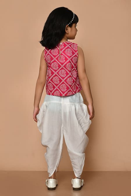 Pink sleeveless kurta featuring paisley and bandhani prints with gota embroidered neckline. Paired with relaxed-fit dhoti pants in a contrasting color.
