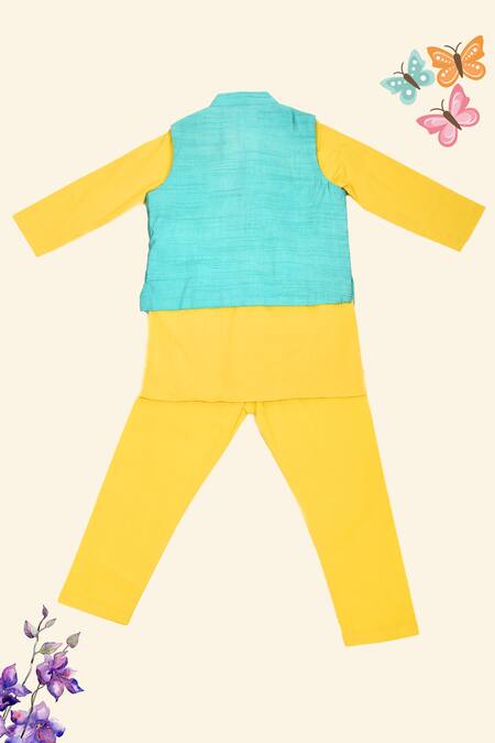 Green bundi featuring multicolor kite placement embroidered motifs. Paired with a yellow kurta and pant set, designed for comfort and style.