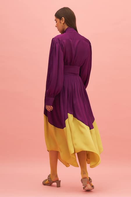Purple blouse with collared belt, V-neck & button details.