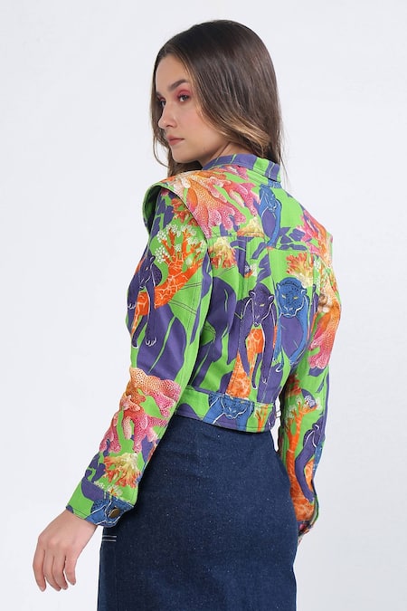 Green denim jacket featuring a blue panther print, spread collar, and long sleeves with buttoned cuffs