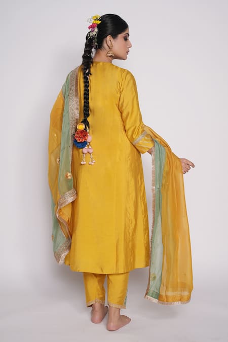 Yellow chanderi kurta with embroidered yoke. Comes with chanderi pant with embroidered patch work & shaded organza dupatta.