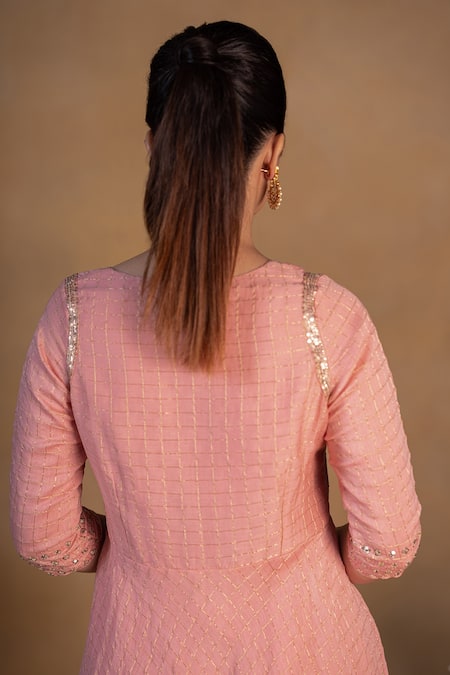 Blush pink chanderi checkered kurta with zardozi embroidered detail.