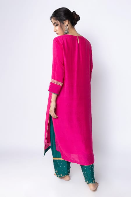 Rani pink kurta featuring zari thread and sequin placement embroidery in floral pattern. Paired with teal pant with embroidery on the hem.