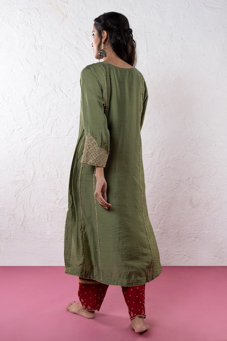 Mehendi green kurta featuring zari thread and sequin floral embroidery. Paired with maroon embroidered pant with embroidery on the hem.