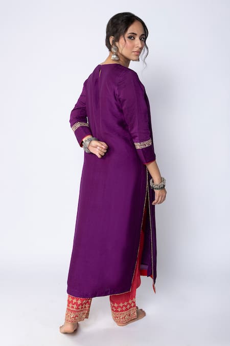 Purple Chanderi Sequins, Zari, Embroidery Round Neck Floral Yoke Kurta Pant Set