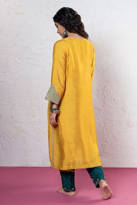 Yellow kurta featuring notched neckline, long sleeves, and sequin & zari thread embroidery. Paired with teal pants and a mehendi green dupatta.