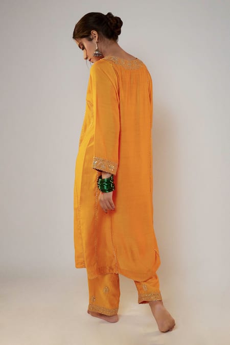 Yellow Chanderi Sequins, Zari, Embroidery Round Neck Work Kurta Pant Set