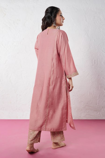 Pink Chanderi Sequins, Zari, Embroidery Round Neck Yoke Kurta And Pant Set