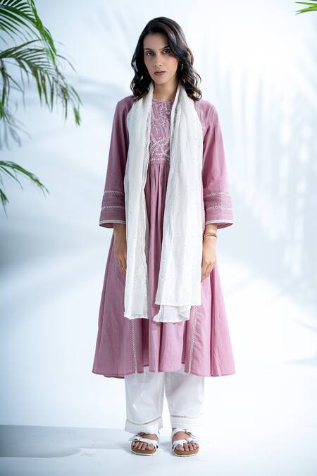 Purple Cotton Lace Round Neck Mauve Chikankari A-line Kurta And Pant Set
