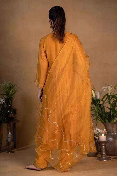 Mustard yellow organza dupatta in embroidered gota and sequin work.