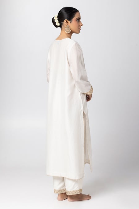 White kurta featuring polka dot print with thread and sequin embroidery. Paired with matching pant in cotton silk.