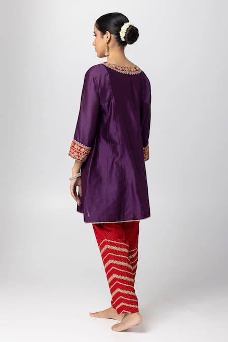 Purple Silk, Chanderi, Voile Embroidery Round Neck Floral Short Kurta
