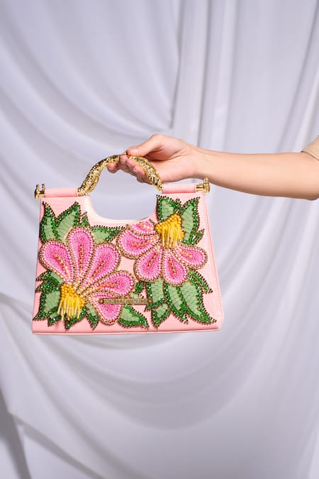 Pink handbag featuring bougainvillea floral embroidery with yellow glass beads and sequin tassels